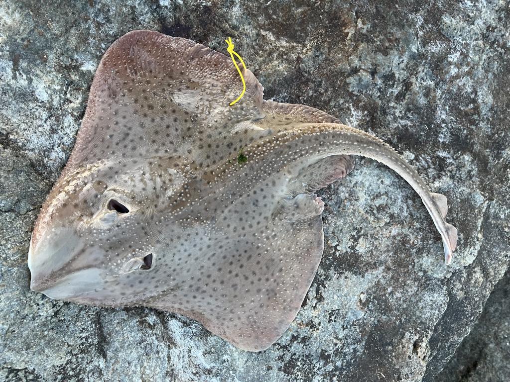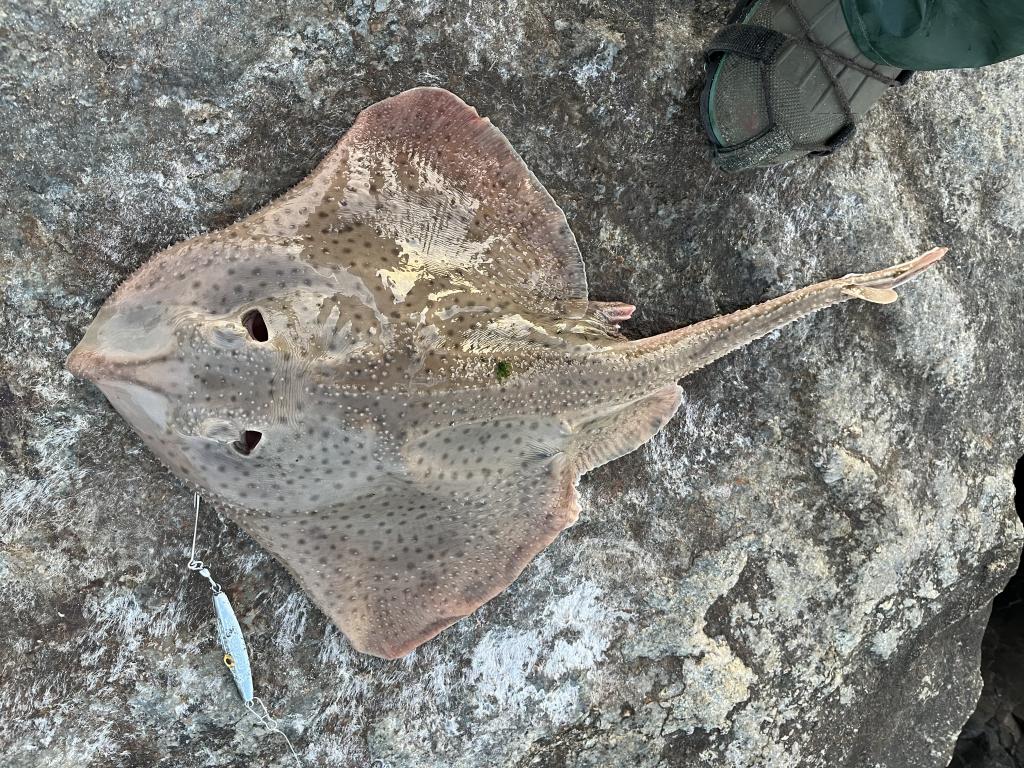 Went fishing 🎣 on the Manasquan Inlet, NJ, north jetty this evening on a warm, cloudy day with a light northwesterly breeze and incoming tide. Saw bait fishermen on the dolos catch windowpane flounder and spiny dogfish. I caught, tagged and released a 25” 4 lb 10 oz winter skate in the ocean on a plain hook Ava A-17. Lost a fish 🐠 on my next cast for the final action of the day. A cast netter caught spearing and sand eels in the inlet at night under the lights. The Point Pleasant squid 🦑 netters were using their underwater green light. I took pictures.