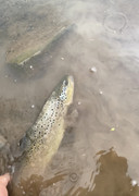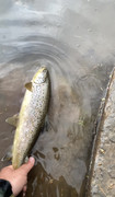 Headed up to trout town this last weekend with camper. Flows have dropped from last week so I left the driftboat home and fished from shore. On the way up we stopped at the local reservoir to see if we could get some browns from shore but found nothing but big smallies lose to shore. Stickbaits were the ticket! Fished a few hirs then got to camp. Saturday morning woke up hit the east branch found browns at the first spot and started getting good then river conditions went to crap with the runoff from the creeks Turing the river chocolate milk. Hope to be back soon with the driftboat for a float and better conditions.