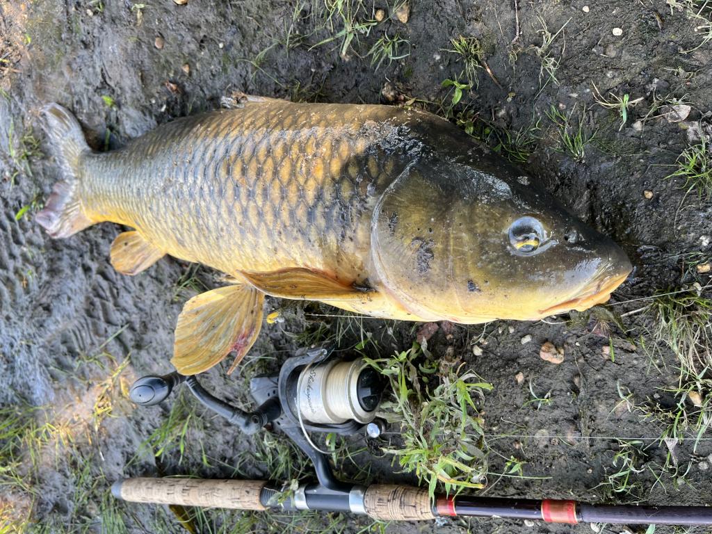 Went fishing 🎣 in 84 degrees Dam Site 21 this evening on a hot 🥵, humid, sunny day with a strong south wind. Saw 7 other bank fishermen and a kayak fisherman catch nothing. Threw out canned, whole kernel corn 🌽 for chum, then caught nothing with my homemade corn meal bait and while ultralight jigging. Caught and released a redeared slider with corn 🌽 bait. Landed 46 turtles 🐢 this year. Saw a carp jump out of the lake right in front of me then I landed a 28” 10 lb 12 oz common carp with corn 🌽 bait after a great battle. Caught 45 carp this year. The 4 carp that I caught in the lake this year weighed 43 lb 1 oz for a > 10 lb per fish 🐠 average. Not bad.