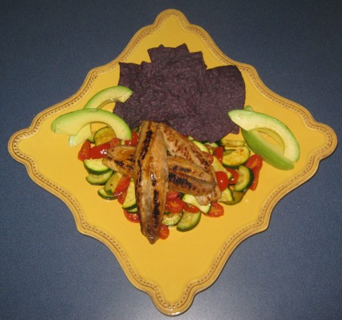 Mackerel with zucchini, cherry tomatoes and avocado/blue corn chips!