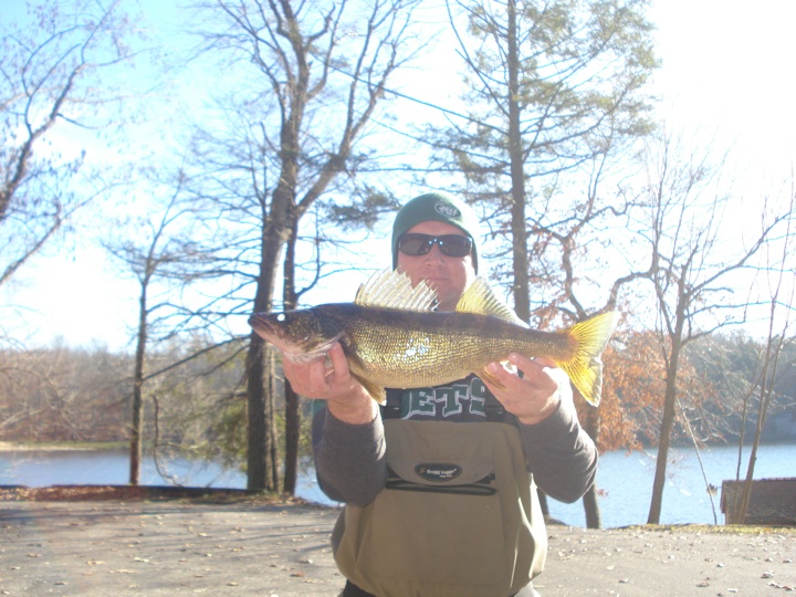 Hit big Swartswood at 930 am looking for Walleye. Waded out to the ledge and started jigging, various lead heads and twister tails, came up with zero. Put the old faithful blade bait on around 11 am got 2 Walleye on consecutive casts. 1 keeper 1 short 17 3/4. Next cast lost the lucky bait and that was it. Keeper went 21 fat inches and a whopping 4 lbs. Hit lil Swartswood around 2 pm I had 2 rods set up for bait, "trout"... Started whippin the inline spinners halfway across the lake, no Musky to be had. I did manage to get 2 feisty rainbows on the deadstick. All in all a so so Black Friday. Nice day to be up in Sussex county. Walleye are hittin hard this time of year!!! TIGHT LINES
