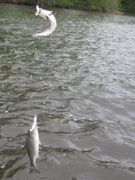 in south bound brook.Ended up with 13 stripers 8-12",5 smallies,and 6 white perch.I was using a white 1/8 grubb with a teaser 1/16 grubb similiar to what you would use will plugging bass in the ocean which resulted in 2 double headers.