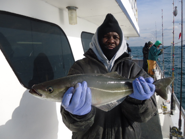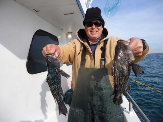 1-3-13 Pretty day offshore today,,,winds were light and the seas for a change were nearly flat...The water cooled down 5 degrees out there from what it has been but it did not seem to hurt the fishing..Loads of life again today,,as soon as you hit bottom you getting a bite..The perch were chewing up the baits but in between we slowly picked away at the Ling,,,some did good,,,Jerry Brown had fifteen ling,,,another had ten,,,,they were bouncing gulp ghost shrimps or swimming minnows on the bottom....In between that we had some Codfish again,,,some Pollock,,,and some real nice sea bass....Also a couple of keeper Togs rounded off the catch...Pretty decent day overall and everyone took home some really good eating fish...Check out some pics...See ya tomorrow...