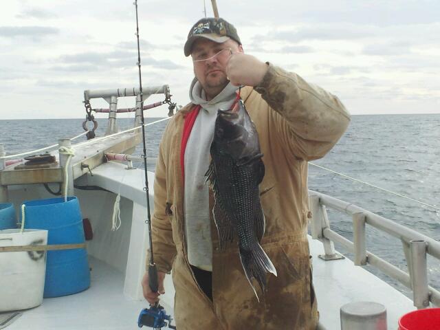 on fishing grounds at dusk. furst light anchor dropped and fish on. thought this was a cod pollock sea bass and porgy trip. No! sea bass fellahs. and quantity was the fare. knot too mention quality. 5 pd. sea bass everywhere.22"- 25" fish! O yeah. forgot too mention me and kush -e-mundez limited out by 9am! shimano flat side jig in green slayed the slobs. banner day . mates r still filleting. great day cap!