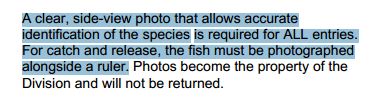 One new caveat for this year is that a ruler/yardstick MUST be in the photo with the fish for C&R entries. Not just in the photo, but placed along side the fish for accurate size measurement So much for the honor system. You think they were handing out cash for big fish. Also they encourage C&R yet they are pretty much making you mishandle the fish by laying it flat on the ground and placing a ruler along it. Fish generally do not lie still and u could be standing there for over a minute. That's a death sentence for most fish. No thanks.