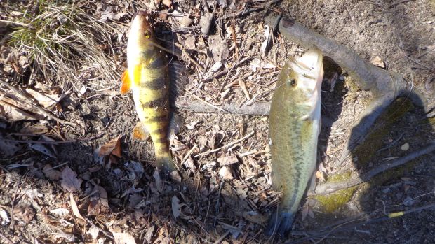 I wanted to avoid trout opening day crowds so I went yellow perch fishing. It didn't disappoint. I must have been on a large school moving into the shallows. I was using a hi-lo rig and was pulling decent sized perch 2 at a time every cast for about a hour. This pic was my second cast, nice perch on top hook and a nice bass on the bottom hook. I was using a 5 ft ultalight with 4 lb line. Drag was screaming!!