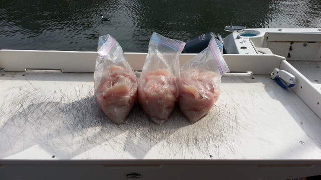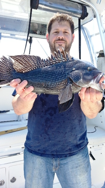 Had a bit of a snafu with the boat at 6am, (one engine wouldn't start) so after switching batteries, juggling cables and a lil bit of luck, we got em going and pushed off around 7:45. Steamed North a few miles off Long Branch and when the WPT alarm started ringing I was staring at the OE resetting her anchors. Just thinking out loud and a few choice words later we decided to switch to Plan B and make a short run to the East. Drifted the wreck a few times to gauge where we would need to be in order to get a grapple set on her and nothing but doggies. At this point between the engine trouble, the late start, someone already on the first wreck, my frustration level was almost at it's peak. After a few misses and finally a good set we were draining clam bellies and squid cuts and starting to build a bite. Few doggies mixed in here and there, but after the commotion down deep started peaking the fishes interests we were bailing biscuits in the small to medium size class. Picked through a number of shorts, and right about when the S-SE wind started to come up we re-positioned on the wreck and started wacking away. Drop and reel pretty much for the next two hours, had a few nice doubles mixed in with some solid 2-3 pounders. Biggest fish was about 4.5lbs going 22.5 inches..caught by yours truly. All in all we managed to make some pretty dam good lemonade with all the am lemons, and finished up with a 3 man limit leaving the wreck around 1:30pm. Had a few cookie cutter toggy (released) in the mix, and a lone baby blue, but was very surprised not to see one Ding-A-Ling on the entire wreck. Beautiful day on the water spent with my old man and Capt Todd, finished the washing and cutting off as always with some Gentleman Jack on ice and a few Miller Latte chasers. Got home fired up the side burner on the Weber and panko fried up some biscuits with several glasses of Malbec. Couldn't ask for a better weekend closer. Hopefully the warmer weather turns those ocean side flukies on I got 200 jigs just waiting to be donated...