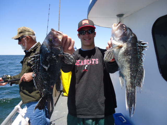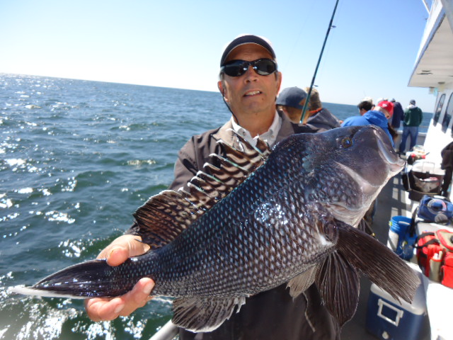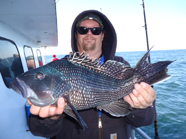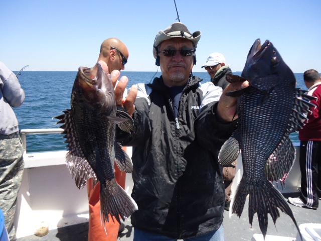 6-4-13 Wow talk about a pretty day on the water,,,it was all that and more today...Flat calm,,gusty Nw winds in the morning made it feel like October more than June but it was very comfortable.I was happy with the fishing today as well..All day we bounced around the rough bottom and picked away at some real nice sea bass,,,pool fish went probably about 4lbs,but quite a few other fish weighed in close to it as well..Each spot for the most part had life on em,,we would just slowly pick at the bass,,,and some nice ling came up as well along with a keeper Codfish..Shallow water believe it or not,,we never went over 60ft.and were in as close as 40...In the end most did decent with fish to go home with,,,some did have a slow day but overall I was happy with what we caught and the life we had...I did notice that the high hooks had some kind of gulp on with a piece of clam,,,green or anything brite worked well.Also casting around moving the bait worked well for some nice ones and some nice double headers..Check out just a handfulof some of these beautiful fish from today,I look forward to tomorrow already!!See ya in the morning,,wind are only 5-10 mph tomorrow so it should be beautiful.....