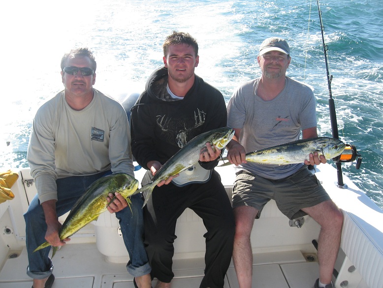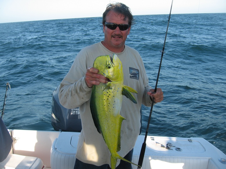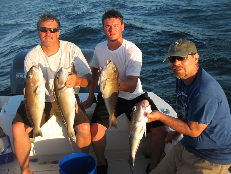 Had Cheryl call me to give her husband Pat his 50th Birthday Gift, he brought his son Mike and buddy Joe. Left the inlet in search for Bluefin, no luck, made some drifts on wrecks for Cod and Pollack no luck, made a run for the canyon, got there and found all the life we wanted, whales, porpoises and bait but no tuna. Changed gears and started tilefishing, had a fast drift that made it tough but nailed half a dozen goldens and bluelines. Went back on the troll still no luck, set up for the night, no bites until 330 when we had a monster on a jig, fought the beast for half an hour making no head way till hook pulled, damn. Went on the troll but again life but no tuna, changed gears again and went light tackle mahi fishing, had plenty of bites with many fished miss but all of the guys got in on the action. Picked up and ran inshore to look for bluefin, greeted by big nasty bluefish. Ended the day getting Seabass and ling. Fun day with all of the guys catching their first tiles and mahi.