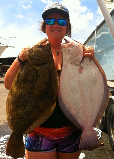 Went out on a friends boat at sunrise, netted some bunker in the bay and headed straight out to the ocean. It was a beautiful morning with good fishing. Lots of shorts, a few skates, doggies, sea robbins, and even a big day eel. My husband Andrew caught a fat 8 pounder. I had 4 keepers, two biggest being 8lbs and 7.5lbs. It's going to be hard to ever top this day of fluking for me, these being my two personal largest flukes to date. Not to mention the beautiful July weather (except the slow to 0.0 drift) and constant action fishing.