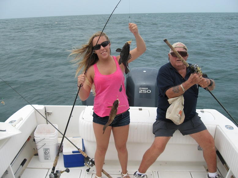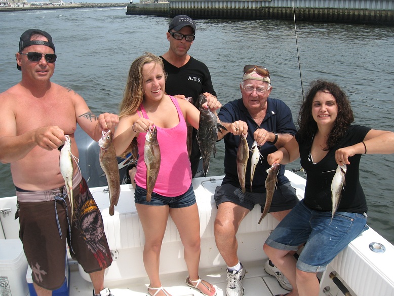 Had Bob Senior, Junior, brother Glen, and daughters Daisha and Jennifer. The crew had won a 4 hour trip through a raffle to raise money for Breast Cancer through Clarks Landing. Loaded the crew and went to the first wreck, divers were there which made us have to switch gears, next wreck had a lot of life, was getting a steady pick going of seabass and lots of ling with Jennifer getting a doubleheader when a storm started heading our way. Made the decision to head inshore and fish the river for fluke, that was a bust. Had a great time with a fun family!