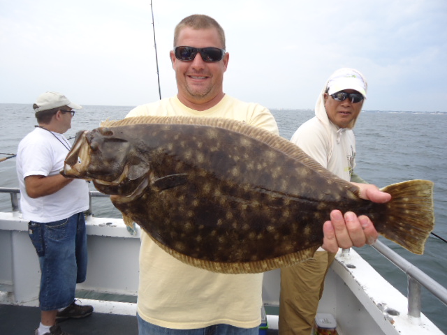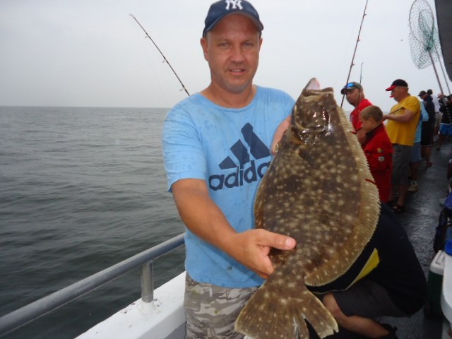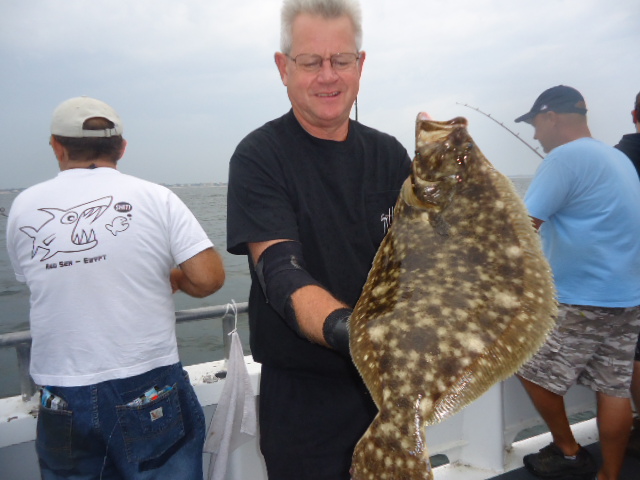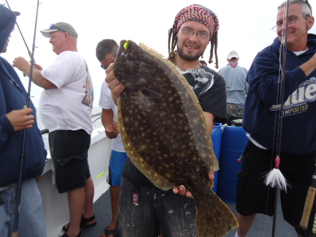 8-3-13 Today was nice,,calm and warm,,a little drizzly rain now and again but nothing to bad..Some quality fish came to the net again today as you can see in these pics below..Nice fish in the 3-6lb.range and one fish about 7lbs.I would guess is probably gonna win the pool.High hook had a limit of nice fluke,,,and down from there..Some people struggled and got the goose egg..No real reason,,some people just did not have any luck..No fault of theirs.I could not even say one way of fishing was better than another..I saw fish caught on both rental rods,,jigs,,and different bait dragging rigs..Tomorrow looks pretty awesome weather wise,,,come down and get in on the action!!See ya tomorrow..pics ...