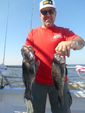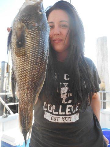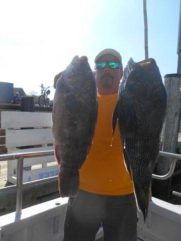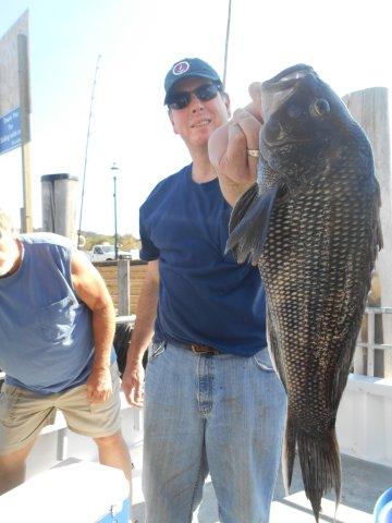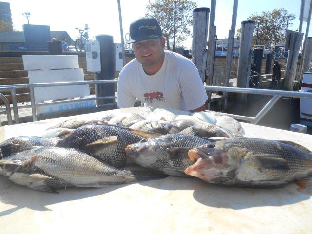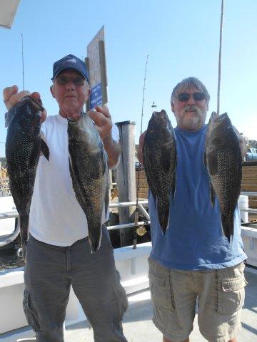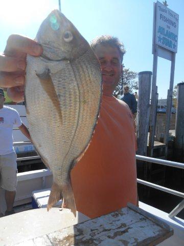 Hey gang, Capt. Scott here. Out again, nine straight days. We have a fair amount of people today (20). Not bad for a Wednesday. One man has high hook of 35 porgies. Everybody seems to be picking away at them. Nice medium porgies, everybody has dinner. I made a few drops off shore today in the deeper water and caught a few nicer togs and some big sea bass. Moved back inshore. There's definitely better action inshore, where we've been fishing. Double anchored on four wrecks today. Rob will post pictures later this afternoon. Big Scottso has been working the galley today. Today's special was porgy picatta. Now that we're bottom fishing, we should be sailing every day unless we get some kind of bad storm. But the weather has been beautiful and it looks great for the next five days. Me, Rob and Brian will see you at 5:30 in the A.M. P.S. We have a special striped bass trip, eeling and clamming, sailing Saturday's 3:30 p.m. - 9:00 p.m. Thx., Capt. Scott