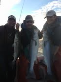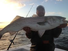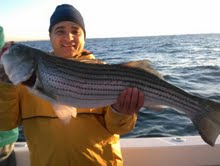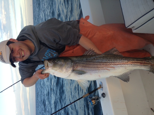 10/22-Ran far east where we had the fish on Monday morning. As we arrived we did not see the marks that we had the day before. We jigged for a little while only to put 2 bass in the boat. We then opted to go do some bottom fishing on a piece over that way. We picked away at nice size porgy and a handful of tog. We then decided to make the run back home. As we were arriving back to our local waters we found a huge body of bass. It was drop and reel for a solid 2 hours. We had them on topwater and on jigs in 40' of water. Every cast had a fish. Fish ranged from 8-40#s!!!! I can easily say we had 50 fish. Jay had the biggest of the day with 40#s on the boga. Jaimie also had 2 of his personal bests with a 30# and 35#. It was great to see this huge body of fish finally local. I added some pictures from our Monday and Tuesday trips