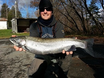 and headed out for the evening bite. I was net man/detangler for Doug so I hadn't fished much to this point so I jumped in the river and whammo first cast steelie, nice fight then brought him to the net and I was happy. Got Doug in the water and all on his own first cast using a 10ft rod hooks and lands his first steelie. As hes doing that Seth hooks in and it was game on till dark. Hopefully Doug left happy and addicted (everyone from the trip has the flu now) so I have not talked to anyone. The rest of the week fishing was good in the morning slow pick afternoon and at its hottest just before dark. 90% of all the fish caught were right in tucked by the bank. We were all using 10-11ft spinning rods with 8lb test and 4-6lb leader with our homemade egg sacs. We made the salmon bite on our flies with fly rods lol. Fishing should be perfect up there any day now. River was loaded with fish there was just so much water they were really spread out. Good luck guys!