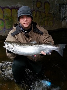 Bunch of us fished the Salmon River this past week. Fishing was a bit below average because of a constant release from the reservoir. The flow stayed at about 1900 for the week and they were only lowering it to 1400 on the last day Friday 11/8. First day out we had my friend Doug (never fished for steelies or salmon before) and the 2 other usuals Seth and Brian. We had 2 hook ups(Seth and Doug) no landing and that was the action for the whole day (4:30am-5pm) and we were really worried due to the height of the water. So since Doug had only 1 day left and we had to at least get him to feel a fish to get him addicted we headed out to a creek to see if there were some kings around from a late run. Well there were and Doug nailed 3 landed one and got his first Pulaski fish. Went back to the room and everyone wanted to call it quits but we got motivated somehow