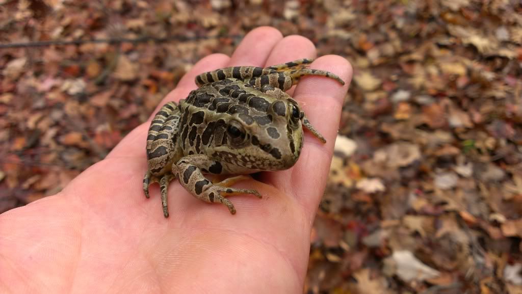 Nice pics. That frog is a Northern Leopard Frog. That species is in decline and nobody knows for sure why. Theories range from habitat loss and habitat fracturing to household and industrial pollutants to diseases originating from tropical aquarium frogs. Perhaps a mixture of all the above reasons. .