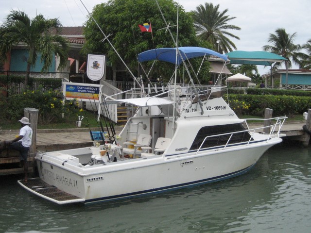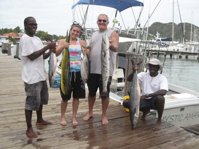 We went to Antigua for Christmas last year. Stayed at Jolly Beach, took a half day charter out of Jolly Harbor. Mystic Amare was the boat name. It was a Phoenix. Nice enough, We caught dolphin, blackfin tuna, baracuda and king mackeral. We also lost a wahoo. We left all the fish for the crew and found out later that most of the resort restaurants will prepare fresh caught fish for you.