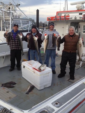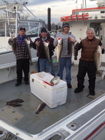 Today we had Chris charter with us to do some striped bass fishing. It was a great day fishing and guys were catching 2-3 bass at a time. Only problem was the size. We did end up with some nice keepers. Even made a fast stop for some tog n we caught a few nice ones for dinner. Thanks again guys had a great time today ....
