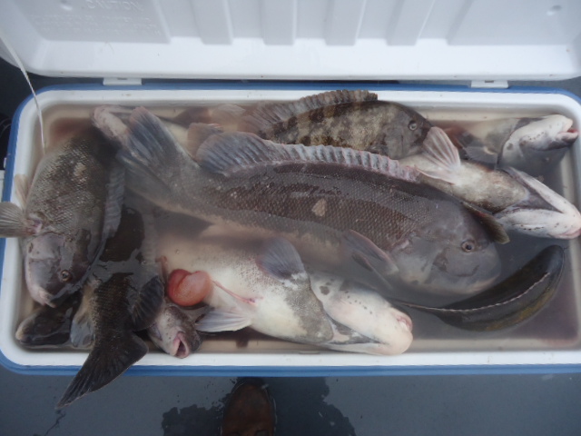 12-10-13 The ocean was flat calm with a nice light breeze today,,,the snow came and went but overall very good conditions..Only a handful of guys showed up to fish,,shame cause it was a perfect day to blackfish and they had the feedbag on...Good fishing all around with some big fish mixed in as you can see in the pics..Up to 12lbs.like the fish we had last week and the whole boat was limited out..Tomorrow is gonna be cold again so dress warm..We are heading back out in the morning,,see ya for coffee if you decide to come,,I have the cabin nice and warm..Trust me I will be in it..pics.