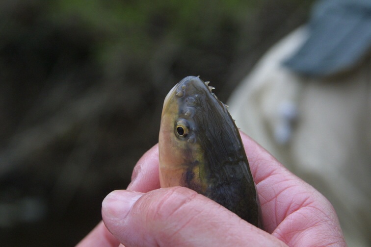 Interesting catch. I can't say exactly, but a lot of male minnows (cyprinidae) will grow horns (tubercles) on their heads during the breeding season. Do you have any pics that show the entire body? .