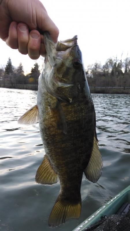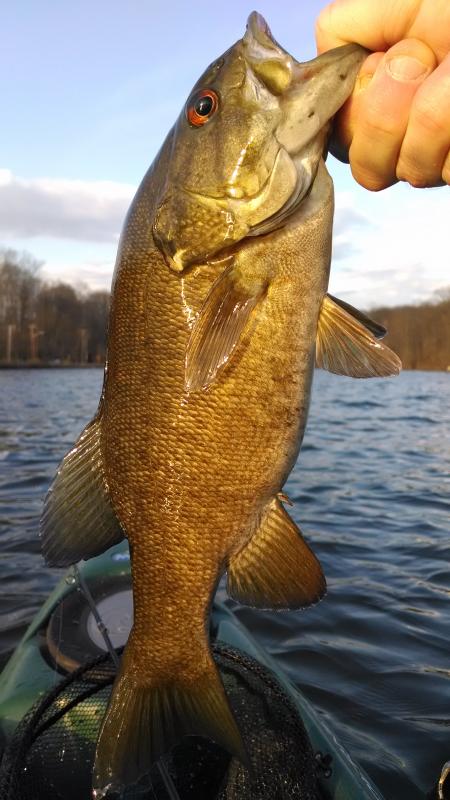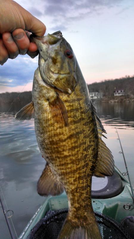 Finally got the yak out today for some after work lake fishing in Monroe, NY. Driving up there, I have never seen the feeder streams and rivers along the route so overflowing. Literal waterfalls created where none ever existed before! Wind was borderline white cap when I arrived around 5 PM but laid down gradually and was flat calm with an hour of daylight left. Water temp was 56 degrees. Managed 4 smallies with a number of misses, including stockie trout that slashed the extra large shiners, but couldn't manage to stay hooked long enough for the net. No slobs but steady action in a nice setting. Nothing like having an entire lake to yourself within easy 45 minute driving distance of Bergen County.