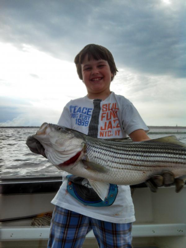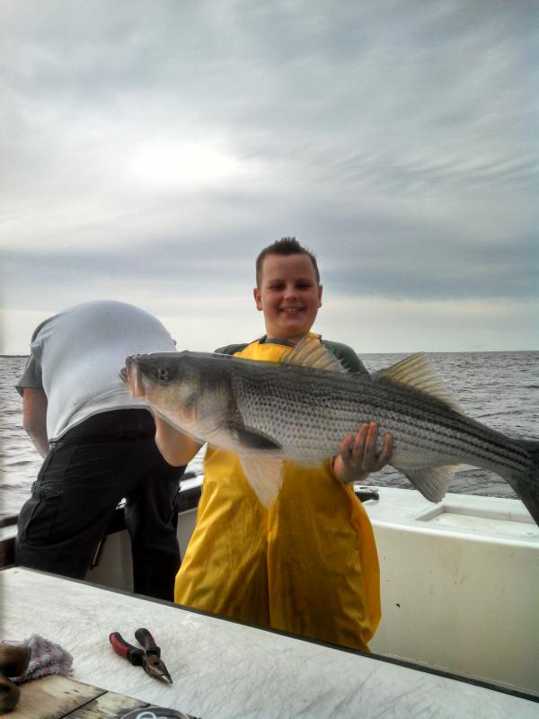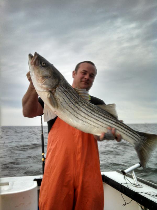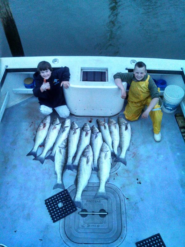 Another meat trip aboard the F/V Roman' Round. Cooper, Andrew, Mike and John owner of BTM Custom Rods joined us last night for some incredible bass fishing. What a difference one day can make. We left the dock around 4:00 pm and around 4:15 it was on and stayed on till we lost the tide around 8:30 pm. (Man it is nice having the bite in our own back yard) All the fish were caught on the troll. Stretch 25's were the main course but can't tell you what flavor. Everyone caught their limit and had a blast.