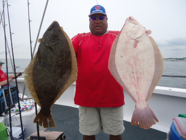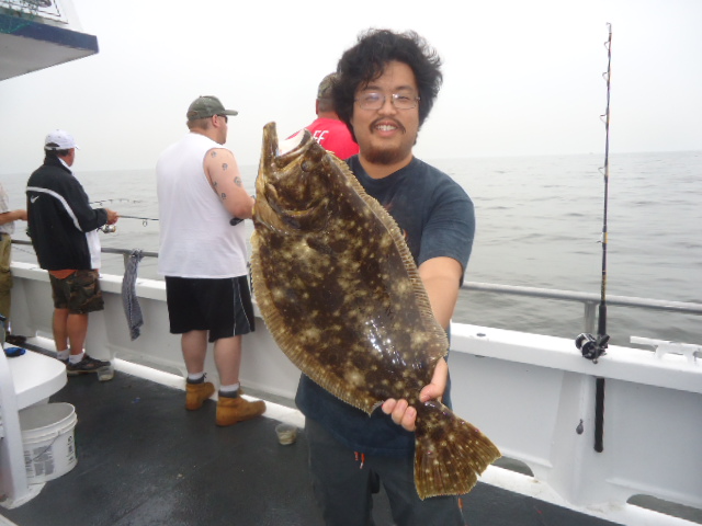 6-19-14 Very good fishing today,,water shot up 9 degrees from yesteday and they were chewing..A little bit of rain at the end but flat calm seas...Had a great drift as well and covered some ground which helped but great action with the fluke,,plenty of just miss fish and nice keepers up to 6lbs.mixed in..High hooks had limits plus,,some had 3-4,,etc..Few did just get one or none but overall it was good..Just check out some of the pics...Jigs had the high hook and any kind of pink color worked better than the green today for some reason...Gulp grubs in pink on a teaser was the ticket..Check out some pics,,,see ya tomorrow..It looks awesome again...