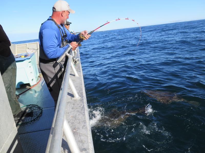 Once we got to the grounds and came tight on anchor the bite started. We were basically fluke fishing with 8oz buck tails tipped with big curly tails. On my first drop I hop my buck tail and feel the tell tale weight of a fish lying on it and promptly set the hook and thought I had the bottom until it moved and 15 min later we were harpooning a 234lb halibut. This action continued throughout the day with many fish over 100#s and probably a dozen over 150# but no more "giants". We also caught Ling cod,yellow eye rockfish, rockfish and some of the biggest skates I have ever seen. For the only time I can remember I was ready to head for the barn completely worn out.