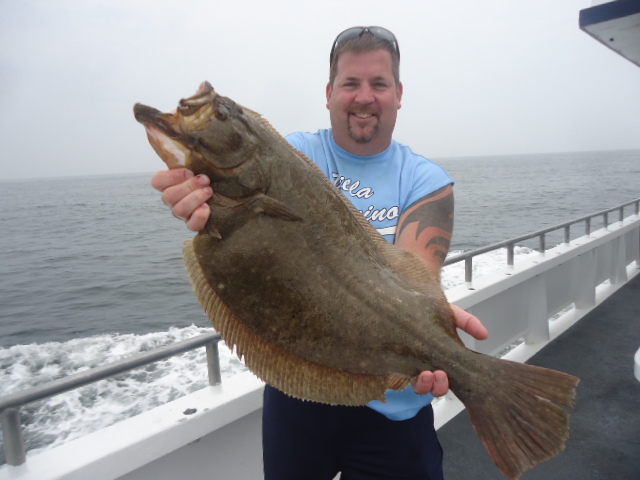 7-14-14 Weatherman got us again,,Flat calm,,no rain out here...Only a small crowd came down thanks to the weather service..Very light drift,,clean cool water...Fishing was slow,,,,few shorts,,not even that many to speak of,,,,few keepers,,,nothing good...Some sea bass and ling,,,,but we did manage to get the net around a really nice fluke that is probably in the neighborhood of 9-10 lbs.I would guess..We shall see when I get in,,,Probably a new seasonal pool leader!!Check him out below.....Heading back out tomorrow,,see ya in the morning...