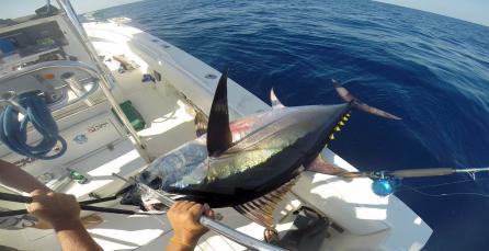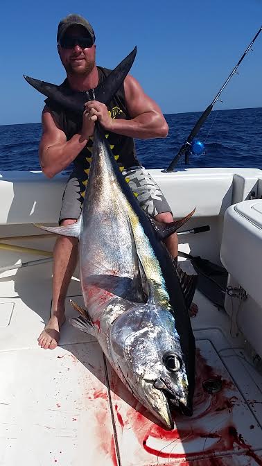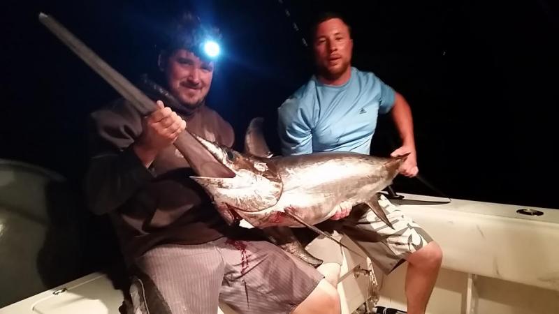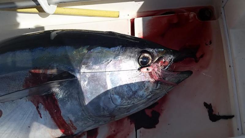 After a tough day on the bluefin grounds on tuesday with only one fish on the jig we decided to switch things up an headed to the hudson to overnight on Friday .. we knew the bite was red hot south an not so hot north but knew what we were after and decided to stay local with the plan..nothing on the troll before dark so set up for the night a bit east of the fleet where we sat the last two overnighter s .. all was quiet till I decided to put a 3rd sword rod down, half hour later Bobby was tight an put a 54in swordy in the boat..Nice! 3 trips in a row with a sword ..up on the troll in the morning there were some boats picking yellows an longfin .. marking some niceeee meatballs knowing exactly what they were we made some tight passes an on the 3rd pass Bam rods goes down an is screaminggg. .2 hours later an in 2000 feet of water we put the first big eye on the Chasin'tail ..Steve stayed on the rod for hour n a half an let me finish it off .. what a great trip .. big eye hit a pink head tuna rocket from Jersey tackle an was fought on the jersey jigger jct rod an avet 30 combo ... also would like to thank pete at Atlantic Bait n Tackle for having all our ice an bait ready to go on Friday!!! Its clutch having a tackle shop you can count on ..Also got to test out some new splash bars n kona lures from tn-tackle that look great in the water !!