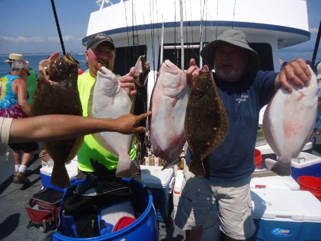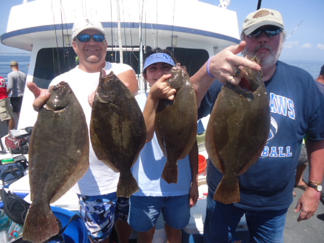 |  Ocean Explorer Sunday 8-10-14 Nice does not describe it out here today,,all weekend for that matter..Flat calm and beautiful...Fishing was hot again early on today,,as soon as we started we had the nets flying..Both nice fish and just miss ones...3-4 fish close to 7lbs....some 3-5 lbs...etc....great action all around the boat..both rental rods and jigs,,,,actually I think the rentals outfished the jiggers early on but as the drift slowed so did the action and the guys casting started picking at some nice fish but the draggers action died...Overall a very good day,,check out some pics...High hooks had limits of fluke,,some nice sea bass to..Tomorrow looks awesome again!!!See ya for coffee...pics