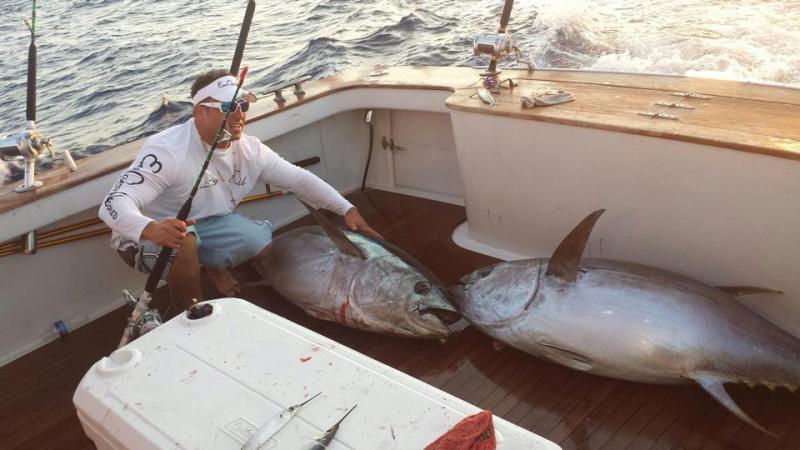 Had a Great charter yesterday 8/10 with a 5 man open Boat we headed to the deep. We did not want to head south to the oh so secret chunk bite so we decided to do what we thought was best and go Big-Eye hunting. Left the dock a little before 1 a.m. and arrived on location around 4:20 a.m.. Cody was setting the lines when we came across some good marks and just as he got the mid-rigger line setup.......BOOM she goes down and starts peeling 30 lbs of drag on a Canyon EX50. The fish took 400 yds of line in 30 seconds so we took the boat out of gear and our flatline gets popped and that fish starts making a Canyon EX16 scream. Our long rigger popped as well but nothing to show for it. Within an hour we had both fish in the boat with the bigger being around 190 and the smaller 170. Guys did a great job going 2 for 2 on some fiesty big-eyes. After that we had a 50lb yellowfin around 6:30 then the bite died. We released a white marlin around 9 a.m. then dropped for some tiles.