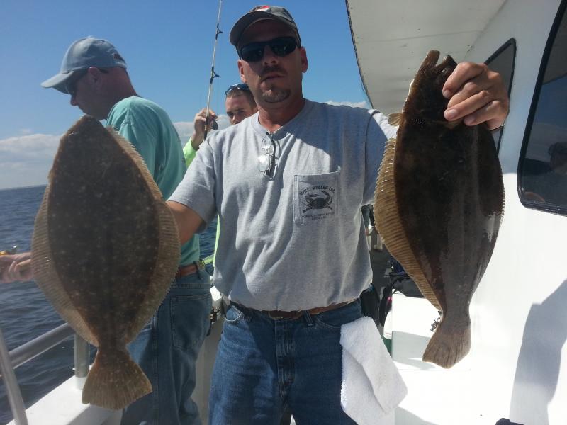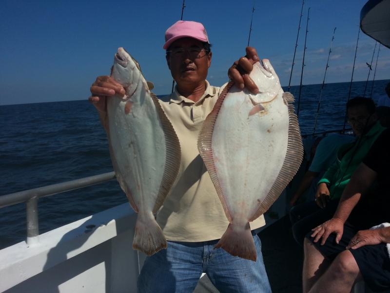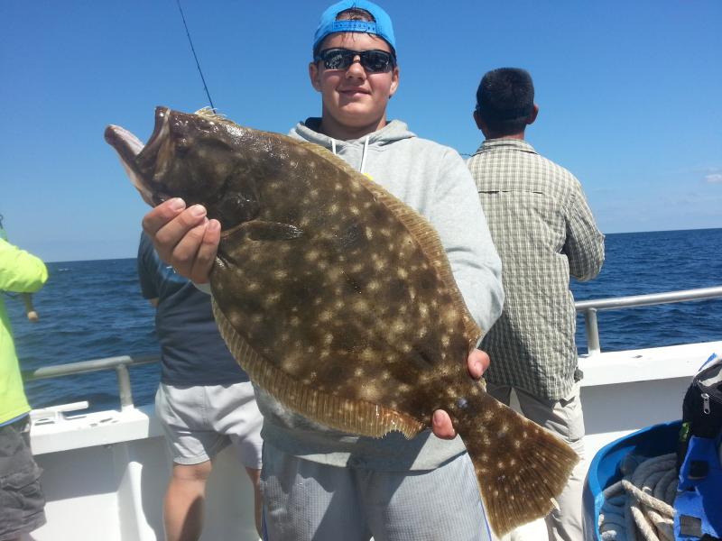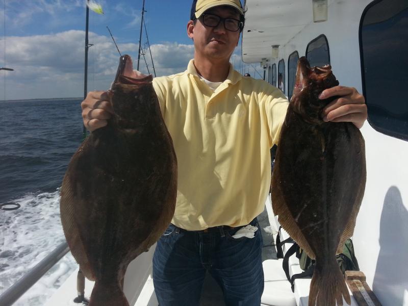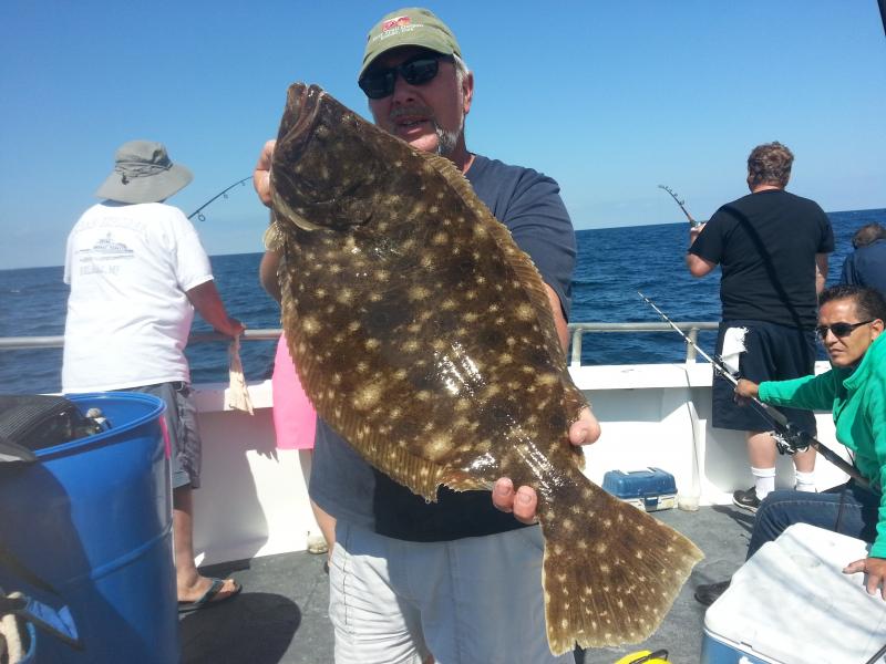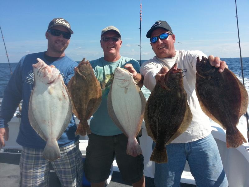 One pretty morning offshore today,,,We had the winds out of the Northwest,,,just a small chop most of the day,,nothing rough...Water was crystal clear again,,warm to..up to 76 degrees..Hammerhead Sharks again today,,saw a few Mahi as well but I did not see anyone catch one..Just really nice all around...Had the fluke chewing again as well,,,loads of fish 17 inches again today,,,inbetween we had the keepers coming as well...Some drifts we only had two keepers,,,the best we had was about a dozen keepers...Everything in between but in the end I was happy with the spread of fish,,,No one caught a limit of fluke but we had some guys with four keepers,,some with three,,two ,one etc...Again as well we had some guys only have the shorty curse...check out some pictures from today,,See ya tomorrow for coffee..
