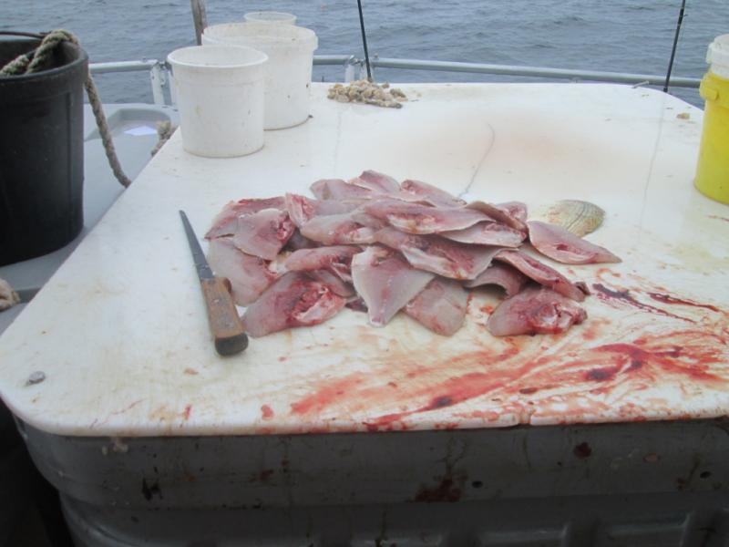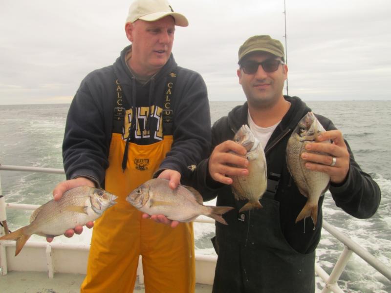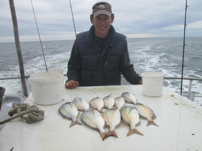 It was another nice red in morning sunrise but the day went smooth. We had good fishing in the morning until the south wind started and then it shut down. There were a lot of little ones today but most guys had from 10 to 30 keepers. Plenty of big sea bass again and i hope they hang around for the weekend. I took a picture of 2 blowfish before they disappeared. YUM YUM!