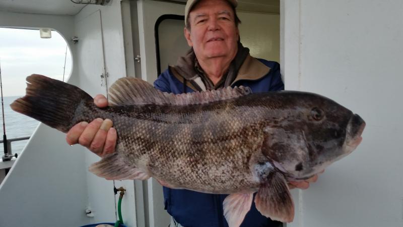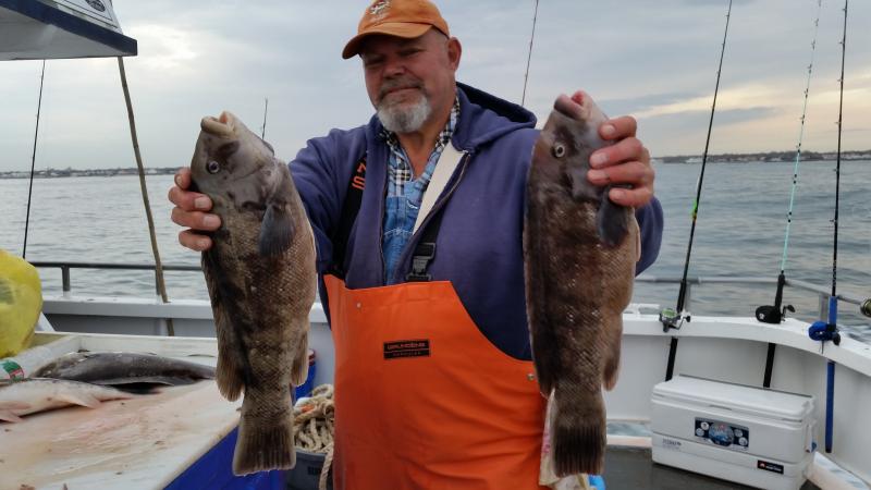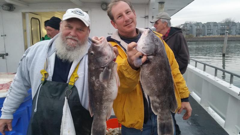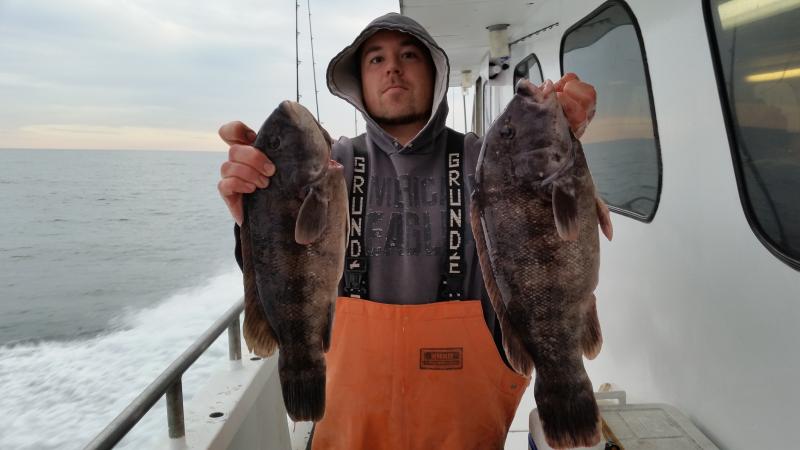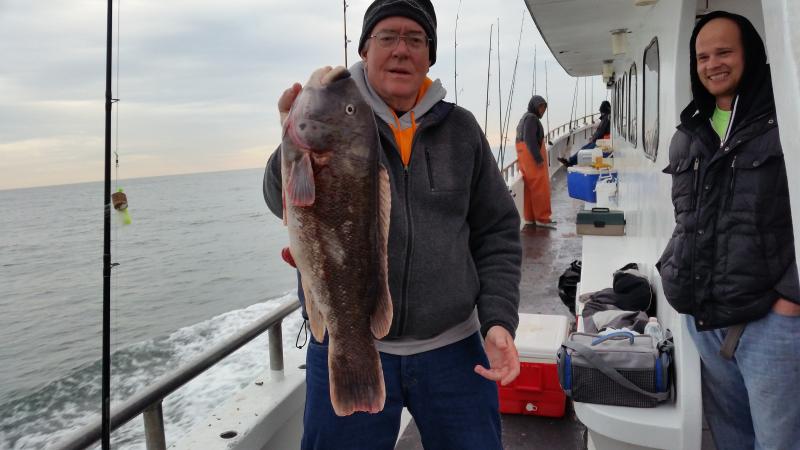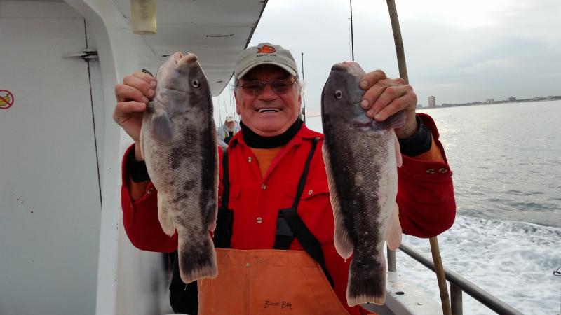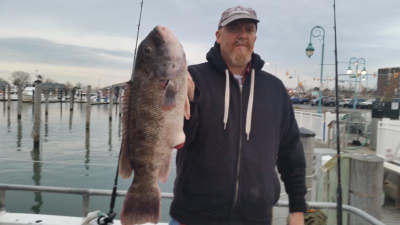 12-1-14 We were out in pretty decent conditions again today,,,light southerly swell was all we really had to deal with,,,,I also loved the temps today,,fishing in short sleeves in December is nice...Well some of the guys got into some real nice Togs again today,,,Hugh took home the pool with a Jumbo that went between 11-12 pounds,,after we confirmed he won the pool he let the big female go to live another day,,,Nice Job Hugh,,,as in previous days to we busted off some real big fish as well,,Just could not stop em and they got shaved off..The guys that were on there game today caught a limit of Togs,,,some had 3-4,some 1-2 etc...Some like yours truly could only feed em,,,they were very picky,,,lots of picking the baits off the hooks and leaving you with nothing to swing at,,or just swinging and missing.. ,,,myself and others were good at fattening em up for someone else...In the end some guys did and some didn't...Check out some pics,,,tomorrow we are gonna shape up to fish but the forecast is not good..You can either come down and have coffee or give me a call and by 6ish I should know if you we are gonna go...Its supposed to start blowing pretty hard our of the east after midnite but maybe they will be wrong...See ya tomorrow..