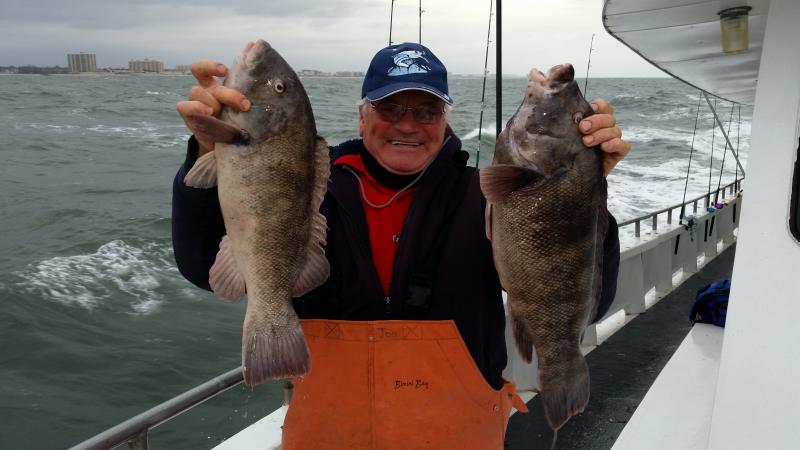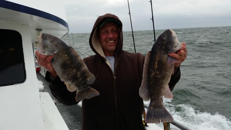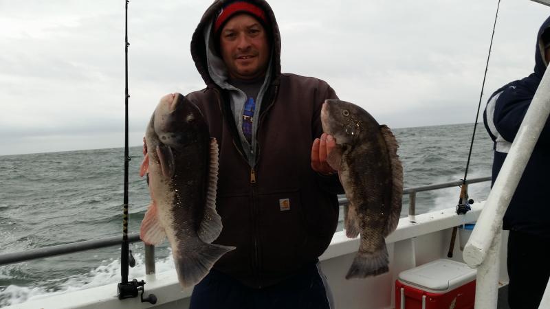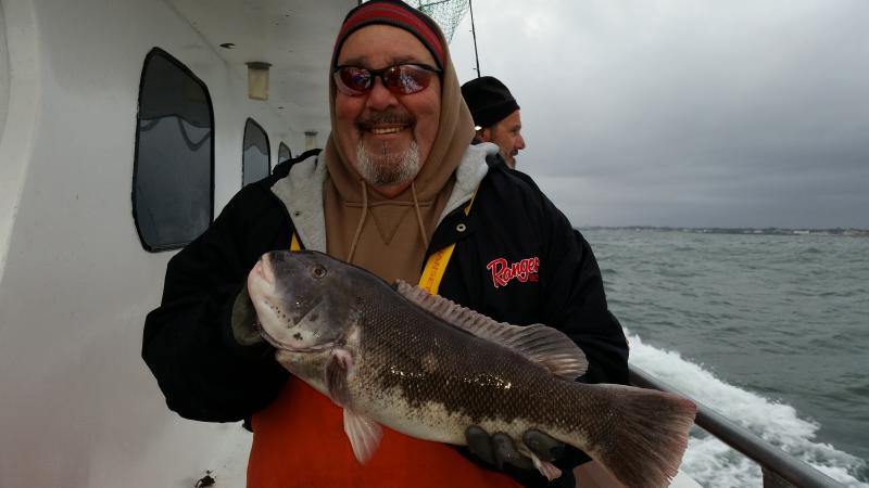 12-5-14 Cranky ocean today,,it blew pretty good out of the east and the seas averaged 6-8 feet all day with an occasional rogue wave mixed in....Fishing was good regardless,,Blackfish Bobby took down the pool with a Jumbo male Tog that went 11lbs.12 oz...He had his limit and busted off some other slobs....Some others also did very well,,,Joe and Kenny almost had a double limit of nice blackfish each,,,they were doing everything right today,,I know they to busted off some pigs,,, and in the back Bobby and Willy had just about a limit each,,some guys maybe one or two etc....but still some guys were not dialed in and struggled,,it was not easy today with the way the boat was dipping and weaving...Either way we had a nice catch overall..White crabs worked best today and tomorrow they are just calling for some rain and no wind so we are looking good,,see ya in the morning...pics.