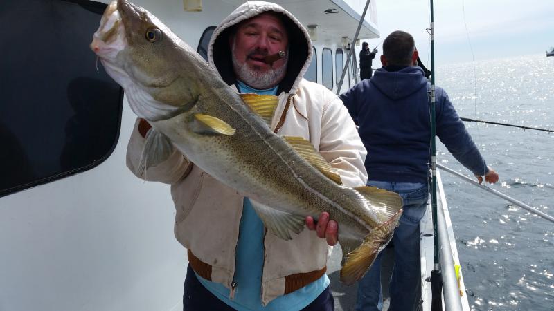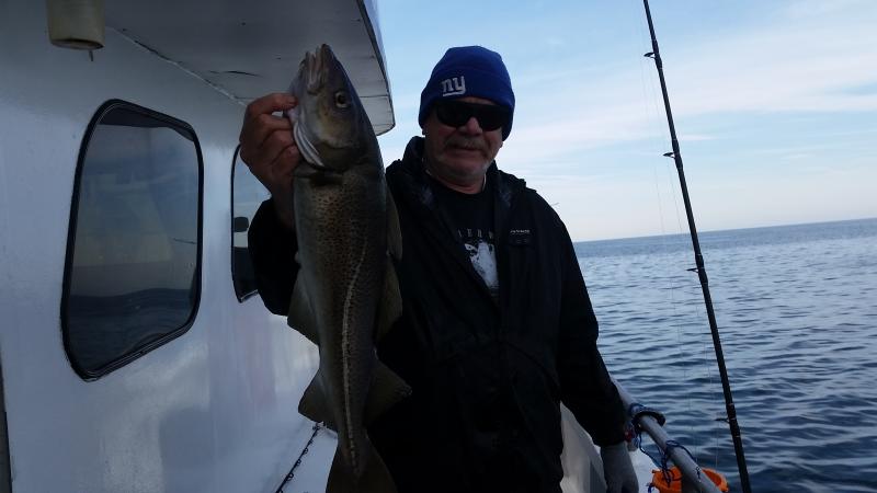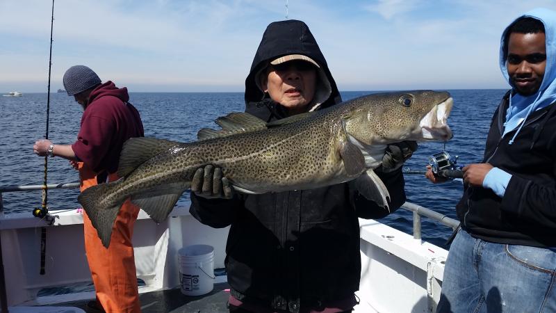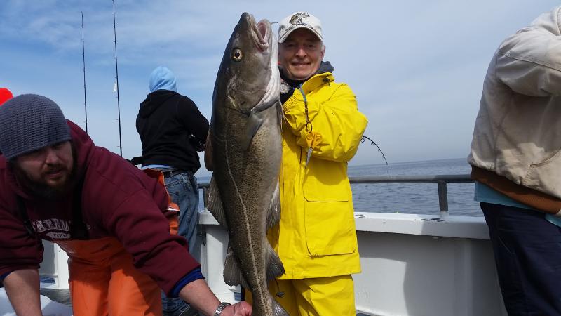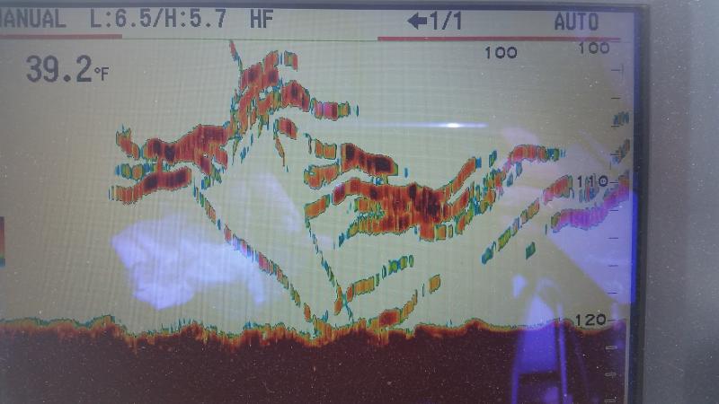 3-25-15 Really pretty day today,,,flat,flat calm,,,almost no conditions to anchor that is how calm it was....We had fish coming pretty quick,,,some shorts,,,few keepers,,,not fast and furious but we did pick slowly at the fish,,,would have been great if they were all keepers but in between catching shorts some guys were getting into some very nice fish,,,at the end of the day we had four really nice fish well over 20lbs...Biggest probably about 25lbs...Hot Dog Tony took the pool with his nice fish he barely wrestled off the bottom...it was a great battle but he finally got him to the net...I have some nice videos on facebook of the fish..Just google oceanexplorerbelmar facebook page to check em out...Actually have a few to put up...anyway we picked all day,,,some dull moments here but the fish stayed under the boat all day,,just cruising under the boat off the bottom about ten feet,,you can see the fish finder picture below,,thats codfish(some nice ones to)...we caught quite a few fishing 10-15 feet off the bottom where we were reading the fish.. overall I was happy with the day,,,High hook had 14 codfish,not all keepers but some guys managed to get 2-3 keeper codfish and we also had some ling and one pollock in the mix..and again the guys that worked at it and kept moving baits around and casting did best,,not everyone got fish but a good majority did.no fish on jigs today,,all bait with teasers,,green and pink the best....check out some pics...tomorrow we are canceled...I do not like that forecast with winds gusts to 35 so we are gonna stay at the dock...Friday looks like the next day to go....any questions feel free to give me a call or text..