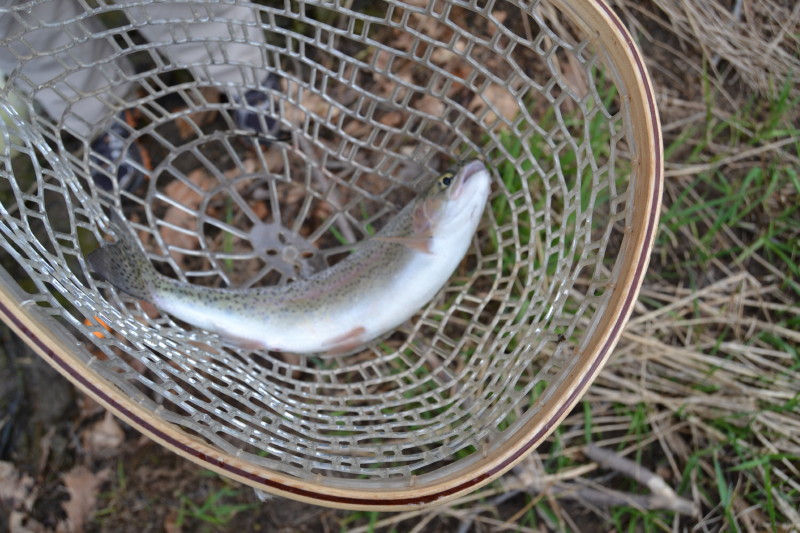 On Friday my dad and I drove up for our annual spring float on the Upper Delaware. After checking in at the hotel, we stopped at the West Branch at the Route 191 bridge on the other side of town. Water was low, and still dropping; we didn't even bother with waders. Walking the bank I got a rainbow, a brown, and a surprise walleye, all on a gold spinner. Dad got a couple of follows but no hook-ups. A fly fisherman showed up and started banging them one right after the other right across the river from us.