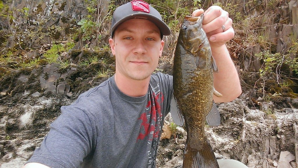 Got out for a bit on the P saturday morning. Had an hour or 2 to burn so I hit a couple local spots. First spot was slow until I looked down and watched a bass chase a few baitfish right up against the rock I was standing on. Tossed a spinner in his direction and hooked up with my first smallie of the year. It was kinda chubby and just happened to start droppin a deuce while I took his pic, lol......