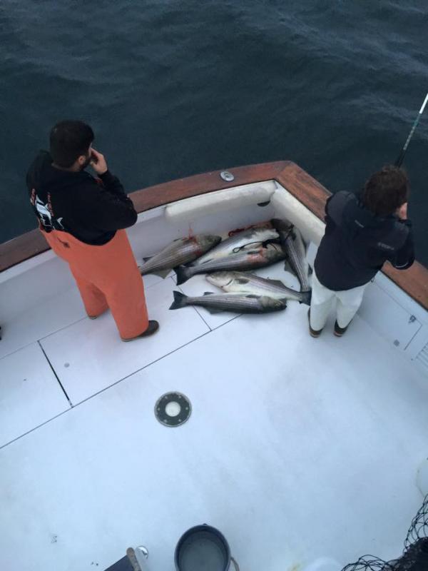 Capt. Chuck and Capt. Rich took the Jersey Hooker out for some afternoon bass action. They were hoping to get on some snag and drop action but no such luck .. but they sure did troll some up !!!! Tony Maja #4 !!!!!! The Guys made quick work boxing up their two over and two under fish .... Brendan was out of work by 6 and the guys picked him up and got back to spooning. Another limit for Brendan ++++ Releases !!! Fishing does not get much better than this !!