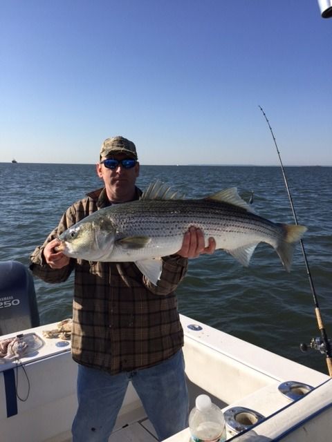 Had Mike and the boys out this morning for some bass fishing. After the past slow days wasn't sure to expect. Got our bait in a few throws and headed to the grounds. As soon as the anchor came tight it was game on with 3 on at a clip. Mix of bass and blues for the next hour and a half. Managed to boat 10 legal bass to 26 lbs (only keeping our legal limit) and releasing the rest as well as a bunch of blues. As a bonus also had a nice 4 lb fluke eat a chunk. Changed gears once it slowed down and tried some flaking but only found a few shorts.