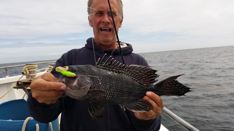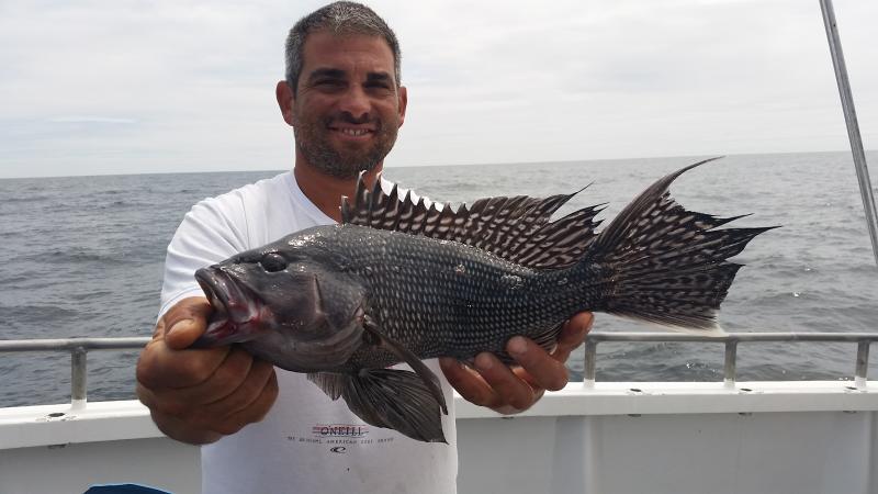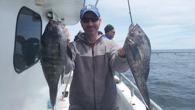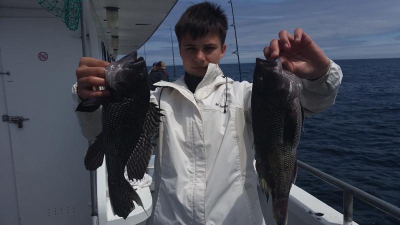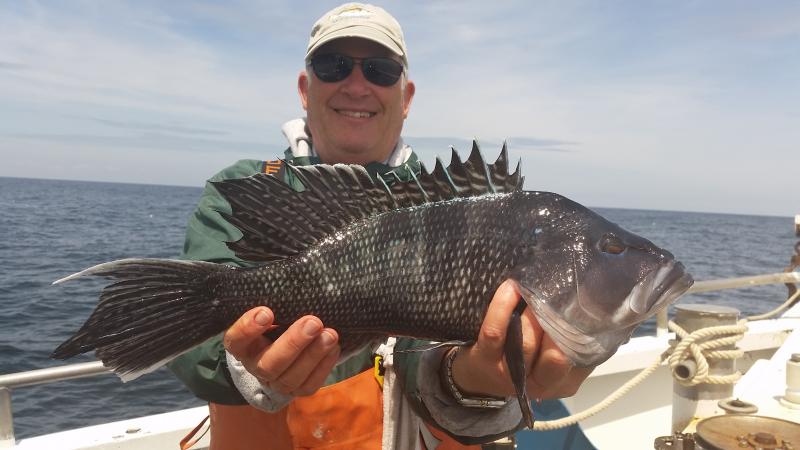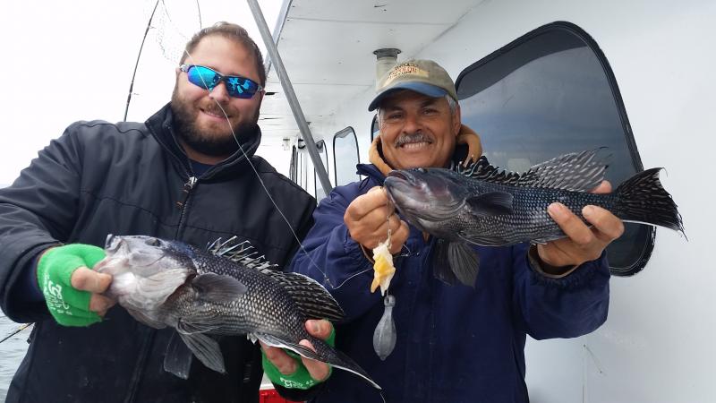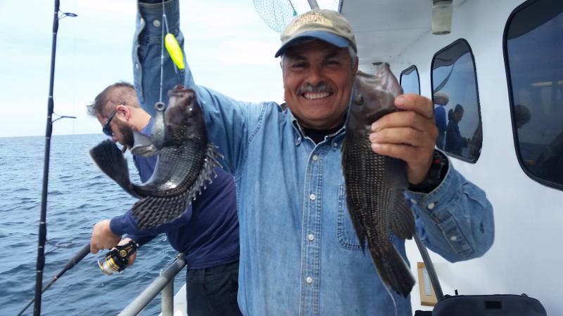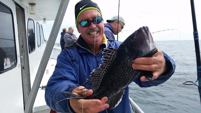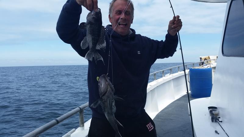 6-3-15 Water warmed up from the east winds and fishing improved dramatically.Temps hit almost 60 degrees...It was 45 when I came in Sunday..Plenty of bites on most spots today with some real quality sea bass coming over the rail,,along with some ling and codfish....Spitting up sand eels all over the deck...keep that in mind...I was using some Jigging world jigs with teasers and catching them....the fish had the feed bag on for sure..check out some pics...we are heading back out in the morning,,,see you then..