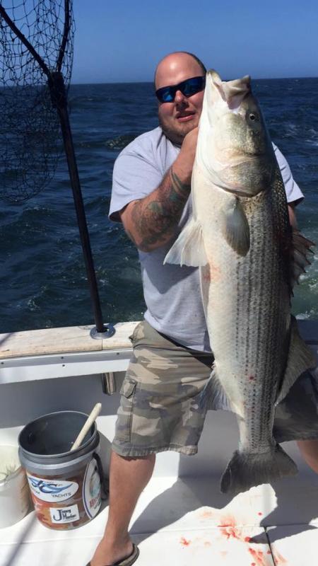 Late Report from Saturday 5/30/2015... Capt Rich , Capt Chuck , Uncle Pete Harko " Master Baiter", Mark O'Boyle, Jonathan Caola and Mike Cipoletti "CIP" Participated in the Jersey Coast Shark Anglers Spring Striped Bass Tournament. The Crew left Manasquan inlet to clams seas and a bunch of fog... Capt. Rich and Chuck had their eyes pealed looking for some bunker because the guys were ready to snag and drop.... No such luck !!! Capt. Gave the order to deploy the Tony Maja #4 bunker spoons @ 300' ... The Jersey Hooker made her way north through the pea soup fog .. Capt. Chuck Yells out to the crew " I know Where They Live " Capt Rich and Capt. Chuck Took turns at the wheel keeping the positive faith ... Working the area hard... The plotter had looked as if they were trolling for Big Eyes at the canyon... Capt. Rich Calls Capt. Allen Lee of the Mushin In to see if he would have any luck ... Capt. Rich said " We keep reading them!!! Reading them like a book" ... They Trolled North South East West and every where in between 2 knots - 4 knots waited for the tide change still nothing .......... It was getting late in the day Uncle Pete was inside rigging up for Sundays Charter Mark, Jonathan and Mike were in side sleeping, Capt. Chuck was at the hell Capt Rich along side him... Capt. Rich Turns to Climb down the Ladder ...... " Chuck We got a bite port rod were hooked up !!!!, Capt Rich Jumps off the bridge missing all the steps on the ladder .... , Grabs the rod and starts reeling ...... looks over his shoulder to see Capt. Chuck Reeling in the other rod and no one else on deck ... Capt. Chuck yells in side "were hooked up and its a big one !!!!! " After a long and very gentle battle with a big angry fish that fought every inch of the way the crew stood around the fish just staring in amazement the beauty and size of this magnificent fish .... Uncle Pete put the tape on him and got a measurement of 53" inches ..... The Crew knew they had a contender ...... they snapped a few pictures and put the fish in the box headed for Manasquan Inlet. Got to Hoffmans Marina the official weight was 51 lbs and 52 1/2" long ......