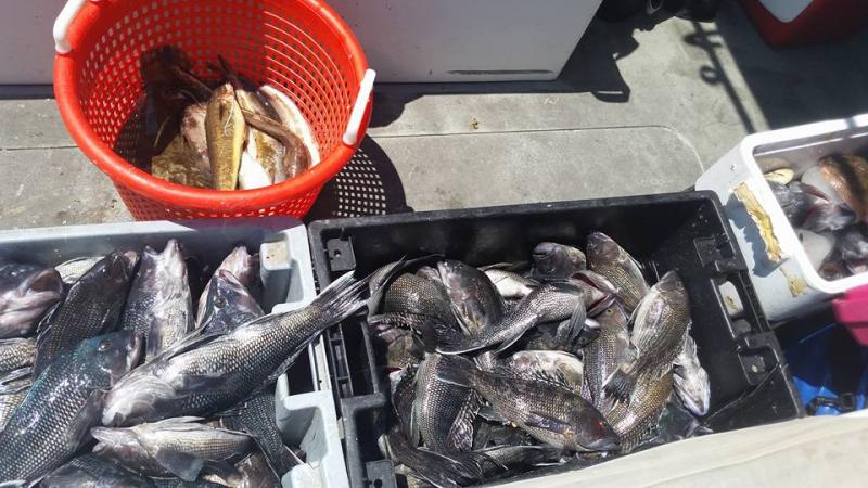 Sat 6/13 Seabass - Well today was a much slower bite for us than we been seeing. Picked some nice fish in the am but after that it was just a few everywhere ya went. Had alot of current today that we didn't have yesterday. Put a catch together but not as many as I wanted... The crew worked hard for 90 fish in the box. Back out now on the pm trip checking out a different area.