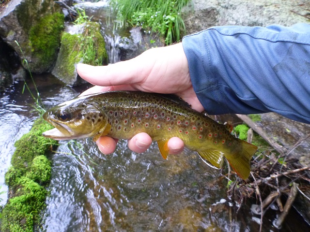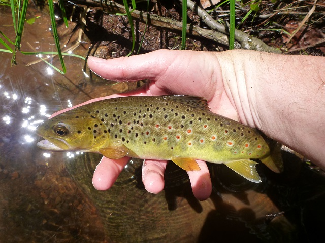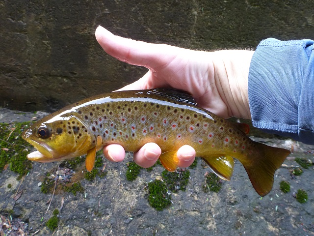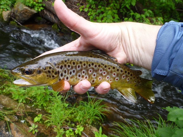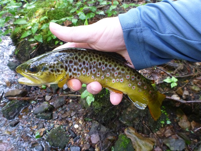 Took the day off and headed up to the poconos where they've been getting decent rain all week. Streams were up but clear and fish were hitting like crazy. Nothing big but constant action all day long from colorful wild browns and a few brookies as well. Some of the spotting on these browns is really cool. Large halos almost like a regional variation yet other browns in the same stream have more typical spotting.