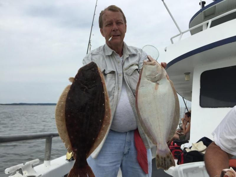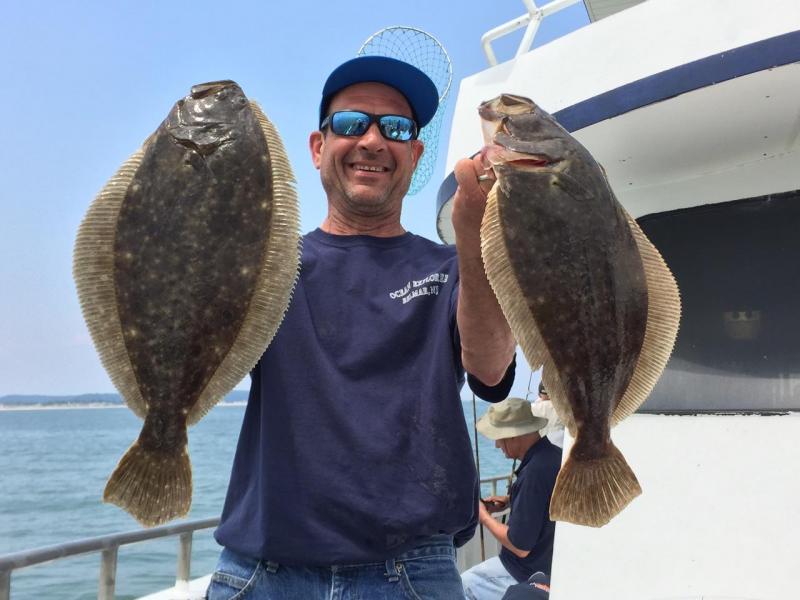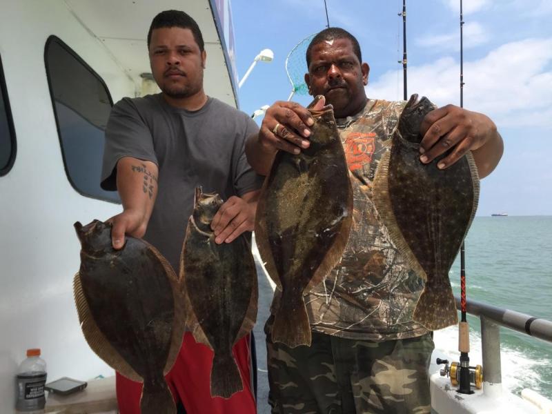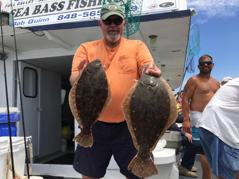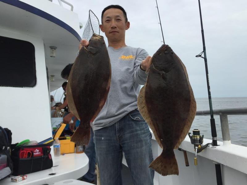 6-25-15 Flat calm,,very nice...wind never picked up today...We had fish coming pretty quick this morning...both shorts and keepers but you definatley had to work for em..Casting jigs out and bring them back brought in most of the fish...big gulp swimming mullets worked well again today as a teaser..glo was a hot color....eventually the drift picked up and we saw more fish dragging bait but still the jigs did best..Guys that were on there game today had 2,3,or maybe 4 keepers,,one had limit..Some only got shorts,,,some sea bass here and there...not a bad day I thought overall ....Pat took home the pool fish with her new pink fluke rod as you can see in the first pick below...She had two keepers...Congrats!!! See ya tomorrow,,we are fishing!!