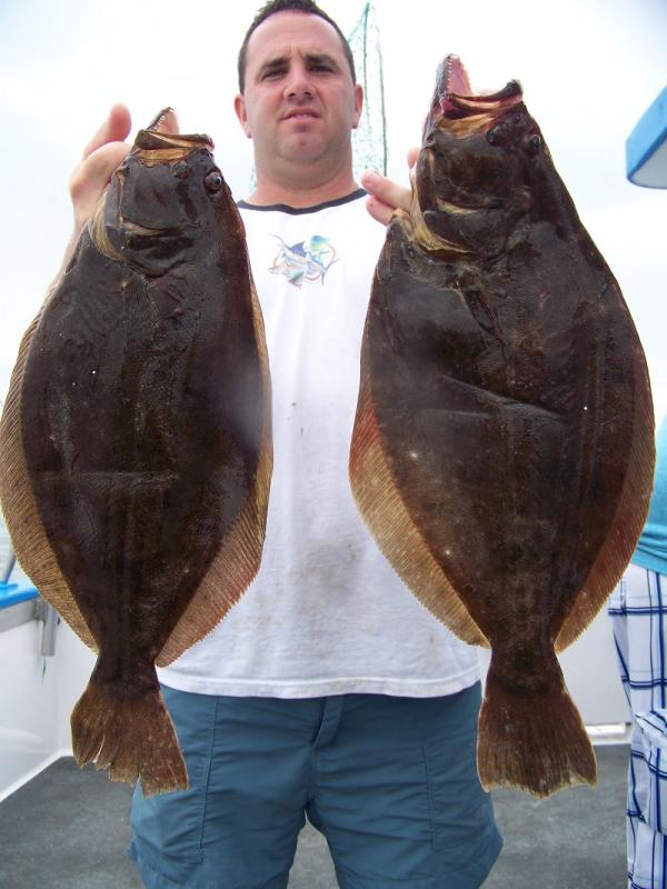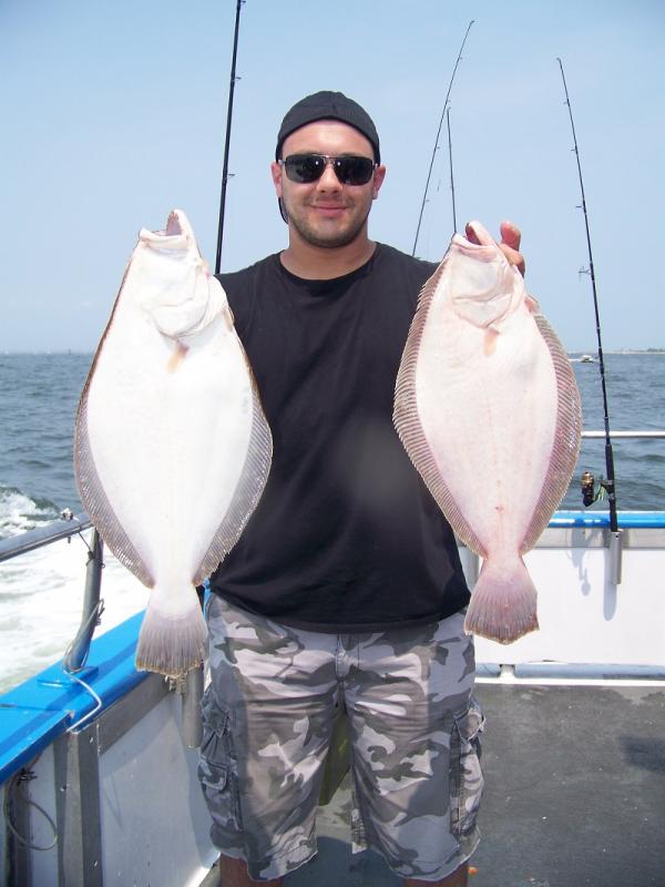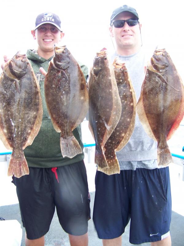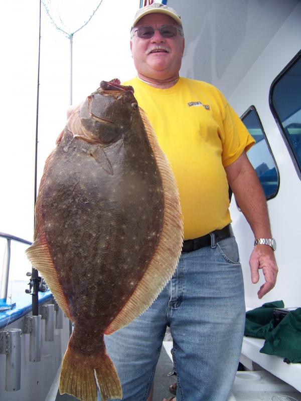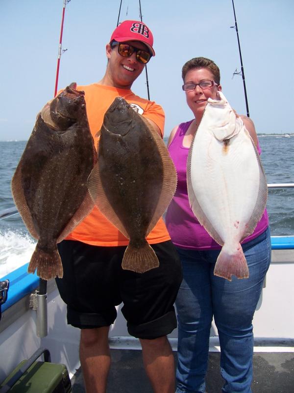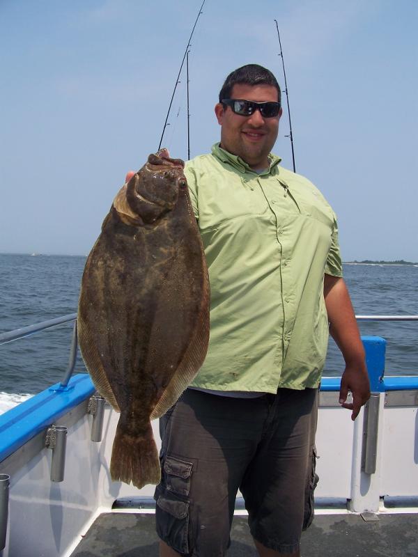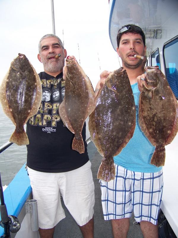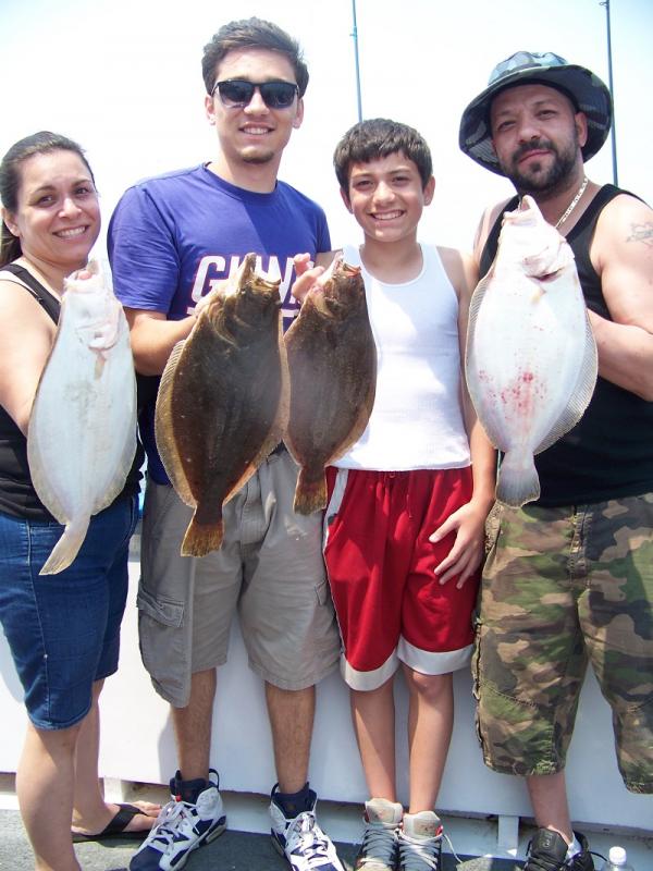 Beautiful day today with some very nice customers. Fished several area's, some produced better than others with quality Fluke, including the pool fish at 6.8 pounds! Had another 5.9, couple more in the 4-5 pound range including Adams 5 pound fish. June had a beauty at 4 1/2 also. 50/50 on the catching between Bait and Jigs today.... Capt. Dan just called and is beating on the STRIPED BASS right now!! Had four on as we spoke. When that dies out he will go catch some Porgies for a nice mixed bag. That will be the schedule for now, Bass first till dark, then Porgies fish the rest of the night. CHARTERED: FRIDAY, SATURDAY and SUNDAY Morning this week. Capt. Ron |