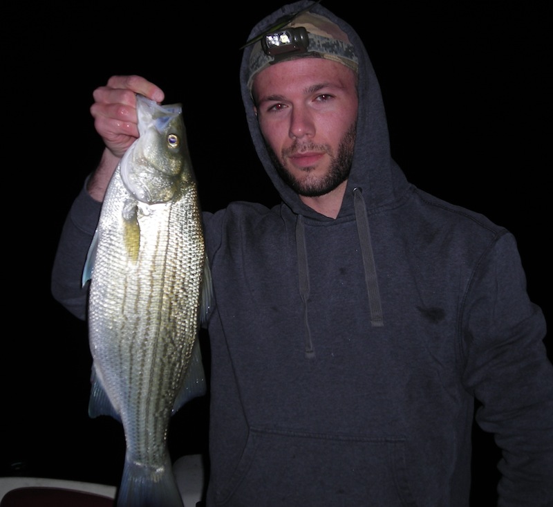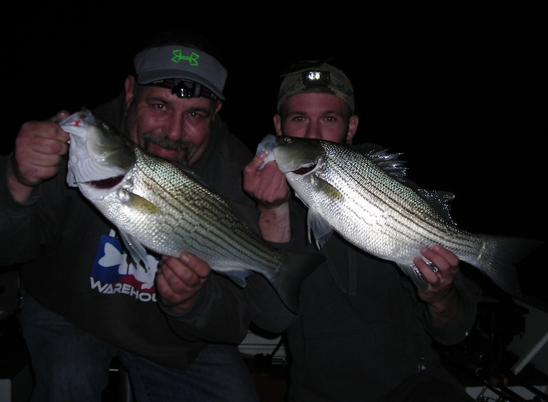 Got at it Wed. night with Dale aboard the GetANet II. Slick calm and an incredibly huge, bright full moon. It was so bright that it actually made you squint when you faced it. Crazy stuff! With the big bright moon above and calm conditions, you could see every swirl, pop, tail slap, explosion and full body leap across massive expanses of water. It was insane! We plugged away from about 11 PM until 230 AM. I finished with 8 fish from barely keeper sized to a bunch of low 20s. Dale had 2: a dink and a low 20 fish that was part of our first double header of the season. DOUBLE!!!!