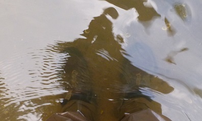 Bushwhacked a short section of the PR today. Only had about an hour or so but caught three largies and a rare smallie. All fat and healthy. Unusual to catch a smallie that far upriver where its sticks and mud. No signs of pike. Included a picture of my boots in the water to show how low and clear the river was. I was standing mid-river(where its 60 feet wide) where it was all of 10" deep. Its about as low as I've ever seen it. Humidity was back today and so were the mosquitoes.